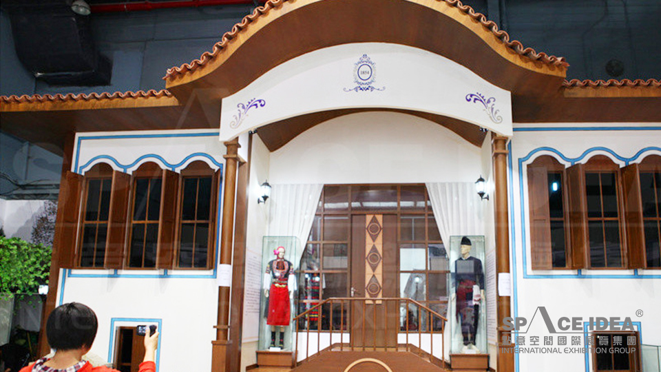 廣場展區(qū)一角仿照保加利亞一座著名的博物館,墻上的壁畫和木雕天花板精美絕倫,軛、弓形窗、寬大屋檐和封閉陽臺具有獨特的建筑特點。