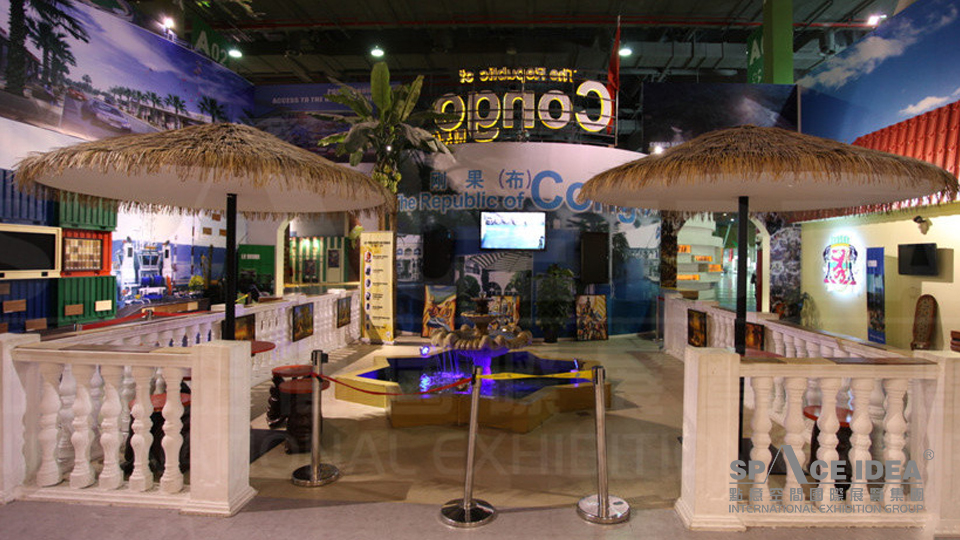 藝術(shù)區(qū)和休閑互動(dòng)區(qū):模擬休閑海灘。通過(guò)一側(cè)輪船、海港造型的展示墻,您將看到剛果今天的發(fā)展成果以及面向世界的信心。