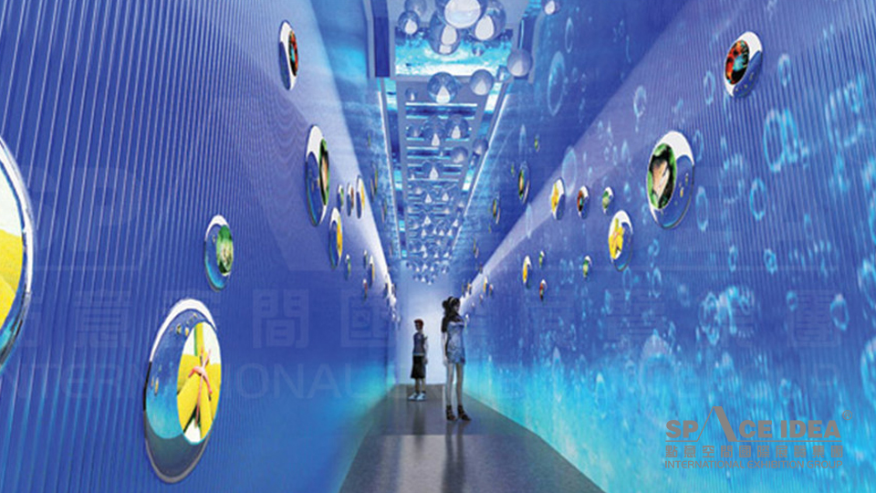 等候區是進入劇場的走廊,其功能性作用是疏導人流。兩面墻體設置高低錯落的視頻裝置循環展示關于海洋主題的中國兒童畫獲獎作品,從童心看海洋的角度演繹世博會主題。