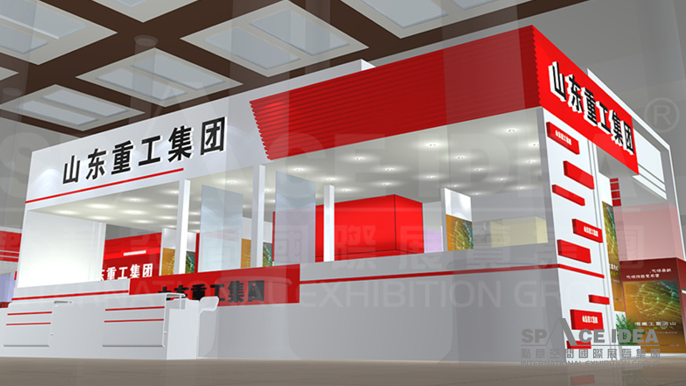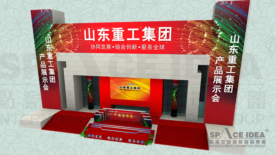 會場氣氛渲染是除了主展示區外的區域。通過對會場內外的展示布局,起到宣傳、指示作用。通過層層引導,持續不斷的視覺宣傳效果,把本次年會的氣氛烘托起來,展示出山東重工集團的實力,為本次產品展示會做好宣傳作用。