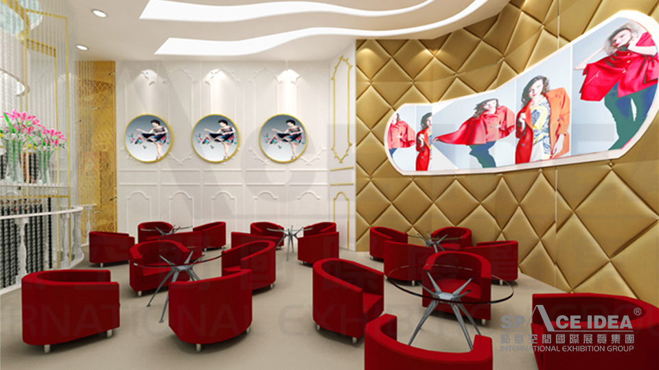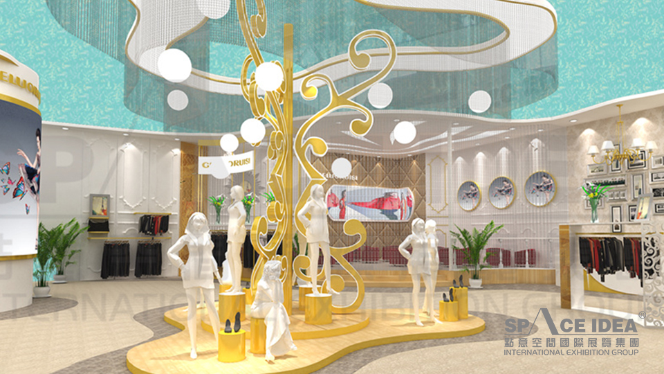 ?    中心展區做為最吸引眼球的設計,它的頂部與底部都采用同樣的歐式異形造型。底部呈階梯提升樣式,使展臺凸顯出來,同時錯落有致的小型展臺便于展示產品。中心立柱作為整個展廳的中心支點,用歐式花藤修飾,既象征著女人的花季,又成為最吸引目光的裝飾,同時又為中心展臺進行了分隔,是空間感增強,錯落有致球形燈凸顯了夢幻的感覺。而與地面遙相對應的發光異型歐式天花配以金屬簾,使燈光經過金屬簾后,變得細碎朦朧閃耀如星光。