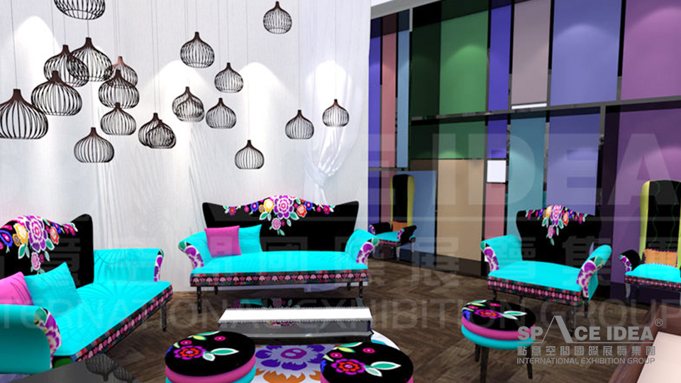 以不同色塊呈現的視覺梯度,配合黑色,體現伊力諾依對色彩的高度敏感與純熟的運用,體現了展覽主題——“羌繡”獨特的色彩搭配。在各種色塊形成的虹彩中,推出影壁式設計的接待臺,給人“曲徑通幽處”的獵奇感。