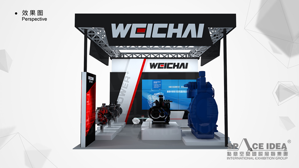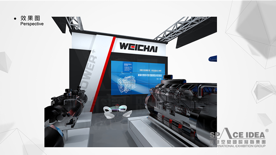 以濰柴LOGO中的黑色為主基調來進行環境的渲染,通過產品展示區進行展示,呈現出濰柴神秘又有科技含量的品牌形象,給人一種厚重的視覺沖擊力。大型LED顯示器,用視頻的形式展現濰柴內燃機的發展歷史及技術創新;設計過程中,采用三面開放的空間構造模式,內部功能合理明確,上面為鏤空設計,整體感覺大氣高端。