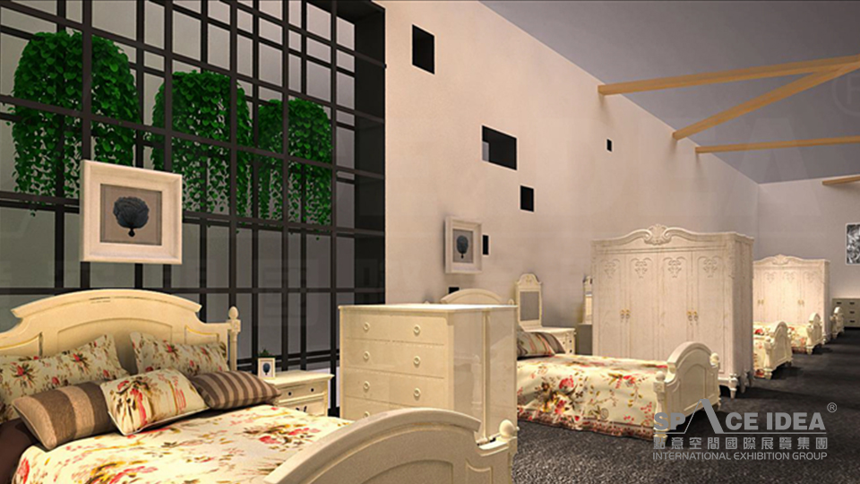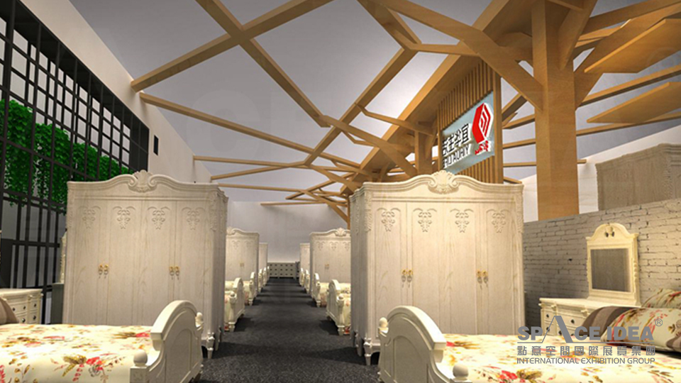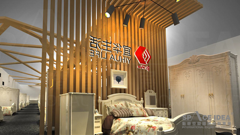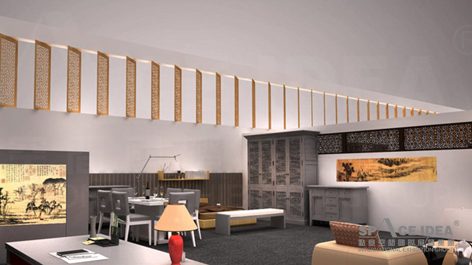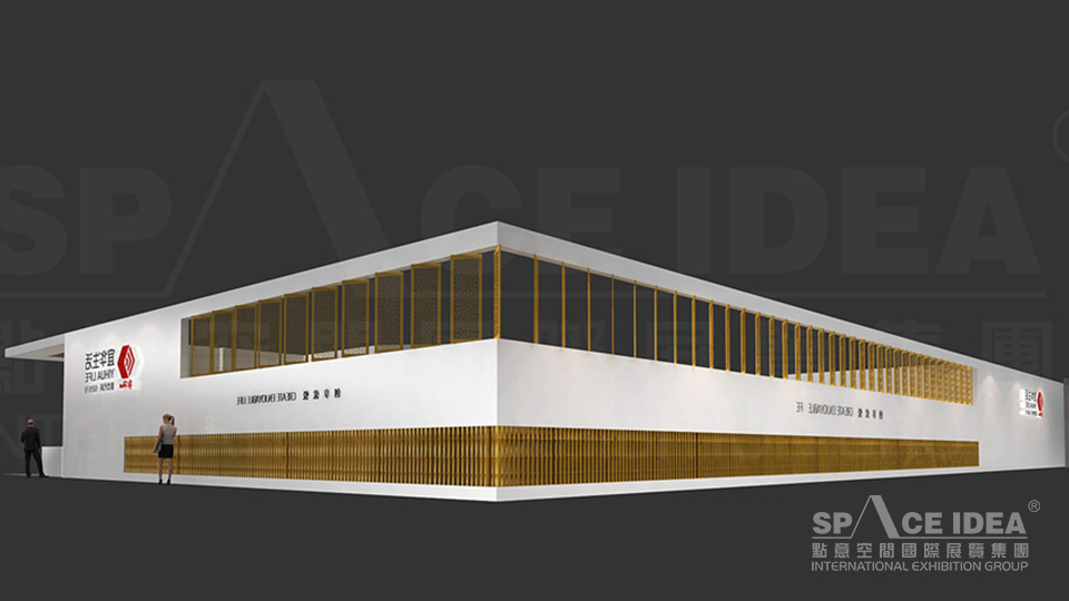 本案以白色及金黃為主基調(diào),宜華生活LOGO圖形傳承輝煌歷史,以明亮的紅色傳達(dá)宜華生活從傳統(tǒng)制造業(yè)到互聯(lián)網(wǎng)住居生活服務(wù)業(yè)的跨越,詮釋一種擁抱生活,激情活力的姿態(tài)。倒立的LOGO可以激發(fā)觀眾的好奇心,又打破常規(guī),不落窠臼。外墻提取中式傳統(tǒng)窗棱加以裝飾,給人一種古典雅致的感覺。展臺(tái)內(nèi)墻壁上懸掛裝飾畫及綠植,與宜華家居的軟體家具、一體化櫥柜衣柜、智能家具及家具用品一起營造出一種宜家宜業(yè)的氛圍。