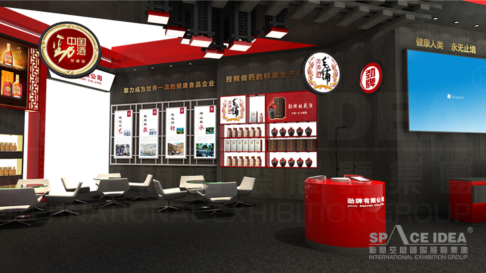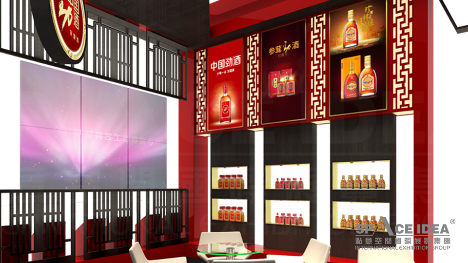 本案以中國(guó)紅為主色調(diào),配以黑色的內(nèi)墻與地板,極富視覺沖擊力。采用中式櫥窗來擺放勁牌各種酒產(chǎn)品,中間擺放了三張桌椅,觀眾可以一邊休息,一邊品嘗勁牌名酒。入口處的大型LED屏播放勁灑的制作工藝,傳播勁牌酒業(yè)的企業(yè)文化及理念追求,體現(xiàn)了勁牌酒業(yè)對(duì)健康生活的不懈追求。