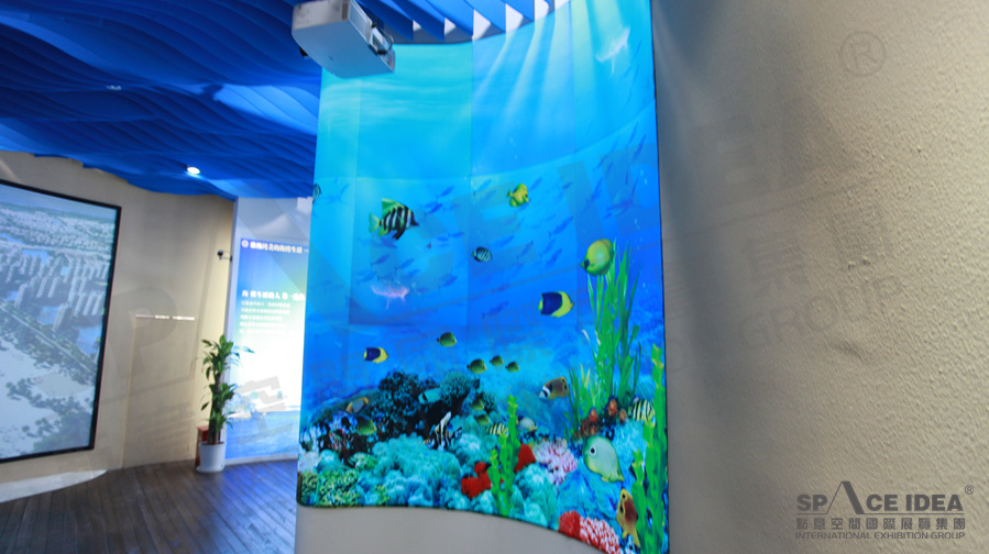 The whole exhibition hall is designed with the concept of sea. The Europe type door head at entrance absorbed the colonnade design element of the main entrance of Venice City, sending out full-bodied European amorous feelings. Entering the hospitality lobby, the first view is the image wall with white bar curve decorative light belt and inlaid with sea blue LOGO. The soft white film ceiling is adopted, which fully expresses the coastal amorous feelings of Venice with sea and water as elements. The sea concept area is the biggest highlight of the pavilion, it is divided into two parts. The first part is the “main sea culture”: it is a complete sea world, blue wave decoration on the ceiling, like a spray, the wall is equipped with a 180-degree arc screen of marine culture theme, designed with a cold light virtual fish tank, sound image playing, swimming fish are very lifelike; the ground is designed with digital interactive screen of sea waves and swimming fish, the latest high-tech sound, light control design and display techniques, all these make visitors feel like they are in the embrace of the sea. The second part is “My Sea”: part of the exhibition hall introduces design method of light box display wall to show visitors international seas as famous as Venice, such as Tokyo Bay, Dubai Sea and Miami Sea, it fully reflects the international taste of Evergrande Venice project; the other wall is a combination of large wall hanging sandbox and cyclorama screen, 3d sandbox shows location of the project, and cyclorama screen plays information related to the project interactively, showing the project content and area location in a full range.